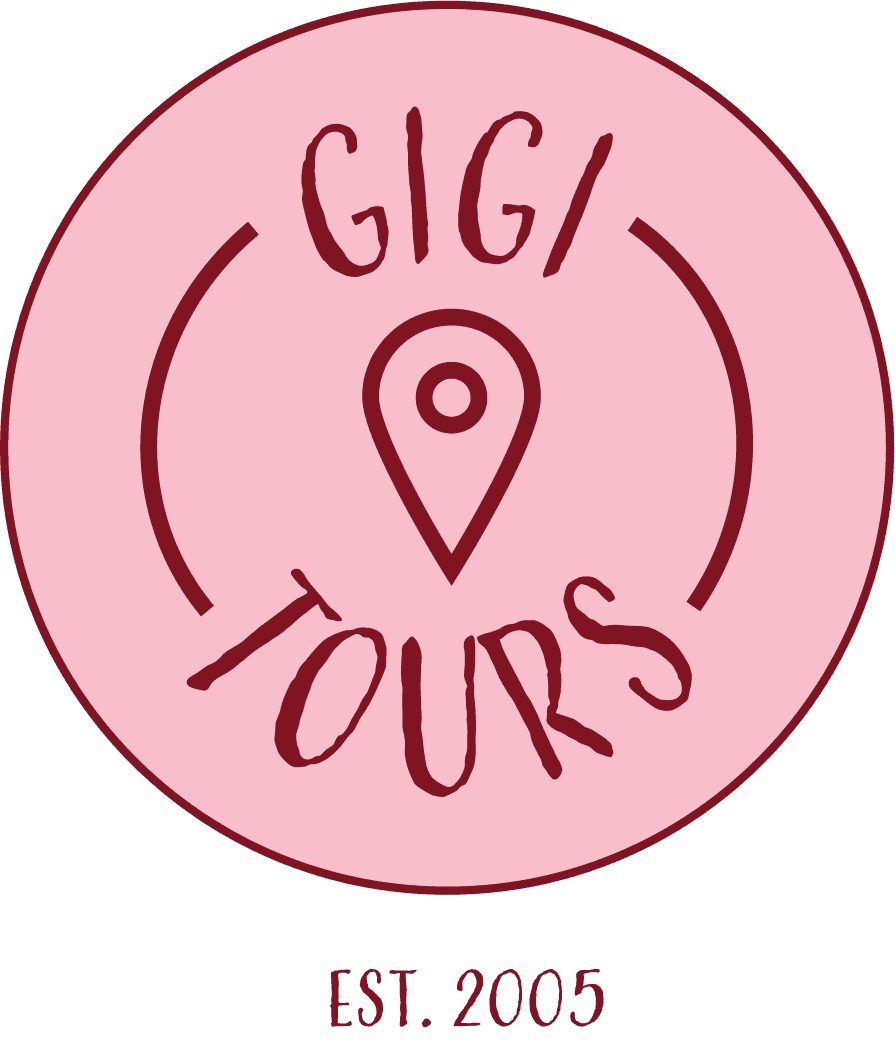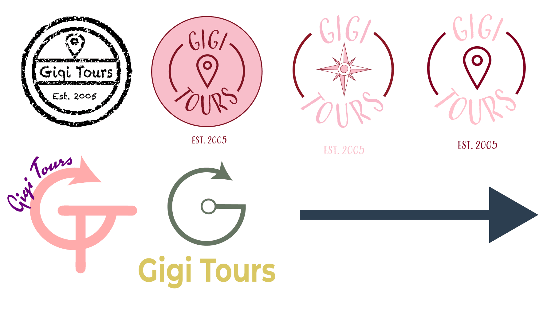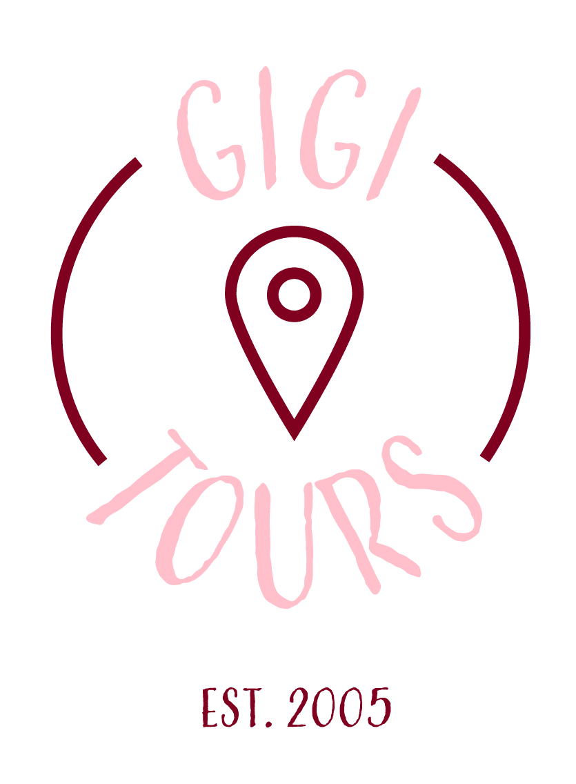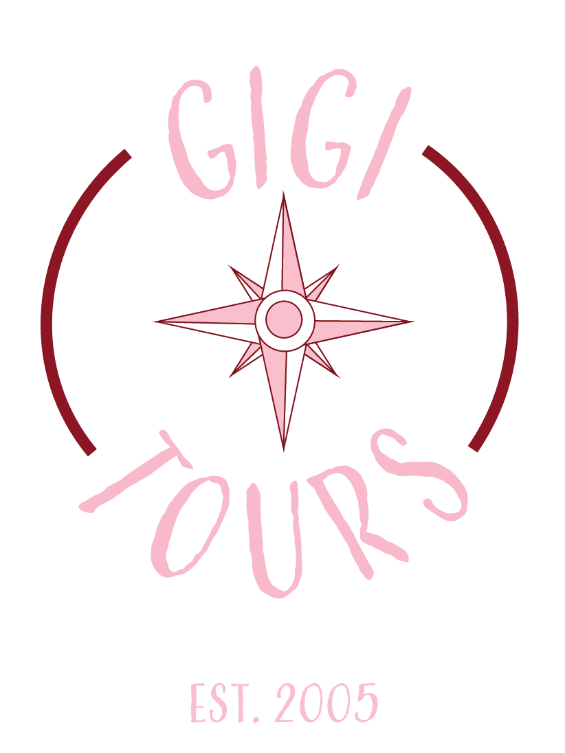The Gigi Tours logo evolved from playful, sketch‑like concepts into a refined circular badge that better reflects a premium, cultural travel experience. The final mark combines a deep burgundy palette with a structured symbol and wordmark, creating a distinctive seal that works across all brand touchpoints.