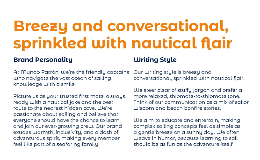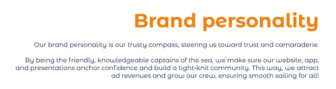Here are some excerpts of the brand book. Because the founder of the company has a joyful, sharp and witty character, I adapted these traits in the idea for the brand personality, of course with the use of nautical terms.